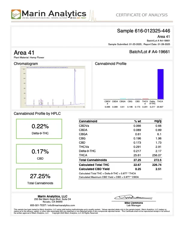 Expect a clean, even experience with a heady lift and easy body calm that’s great for creative flow, social sessions, or winding down without going couch-locked. With THCA content around 25.61% and total potential THC of 27.25% after heat conversion, Area 41 brings strong-but-smooth satisfaction that stays chill and dependable.